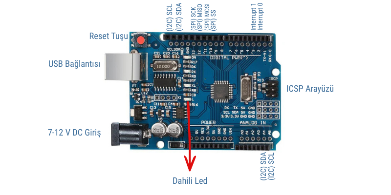13 numaralı dijital pin, Arduino’nun üzerindeki led’e bağlıdır.