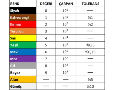 Direnç üzerindeki renkler sayı, çarpan, tolerans olmak üzere farklı anlamlar taşır.