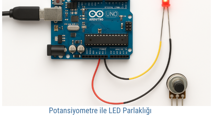 Bu yazımızda Arduino ile potansiyometre kullanarak bir led’in parlaklığını artırıp azaltan uygulamayı kodlayıp devre kurulumunu yapacağız.